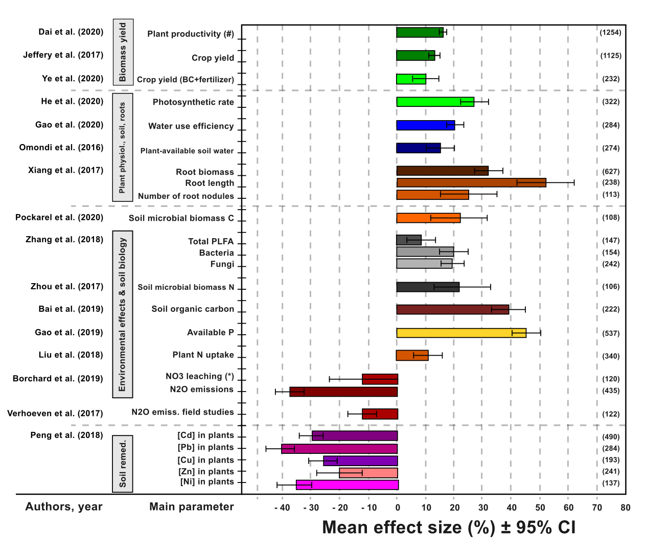 Source: Schmidt, Hans-Peter & Kammann, Claudia & Hagemann, Nikolas & Leifeld, Jens & Bucheli, Thomas & Sánchez-Monedero, Miguel & Cayuela, Maria Luz. (2021). Biochar in agriculture – A systematic review of 26 global meta‐analyses. GCB Bioenergy. 13. n/a-n/a. 10.1111/gcbb.12889.